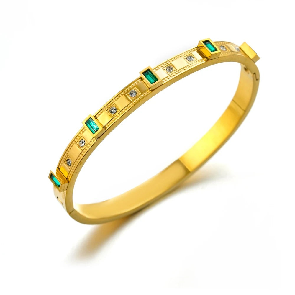 Aproce izgatavota no zelta toņa metāla, rotāta ar taisnstūrveida zaļiem akmeņiem un maziem, apaļiem, baltiem akmeņiem. Viegls un izturīgs dizains ar universālu izmēru, piemērots ikdienas valkāšanai. Der lielākajai daļai plaukstas locītavu (aptuveni 16–19 cm).