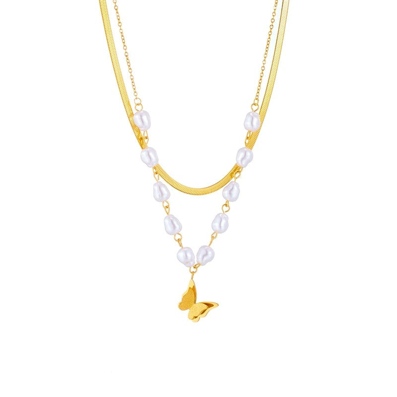 Dubultā kaklarota ar zelta toņa ķēdīti un saldūdens pērļu rindu, rotāta ar taureņa formas kulonu. Izgatavota no metāla un pērlēm. Viegls un daudzpusīgs dizains, ko viegli kombinēt ar citām rotām. Augšējās ķēdītes garums aptuveni 35 cm ar papildu 5 cm pagarinājumu, apakšējās ķēdītes garums aptuveni 40 cm ar papildu 5 cm pagarinājumu, kulona izmērs aptuveni 1,5 cm augstumā un 1,2 cm platumā.