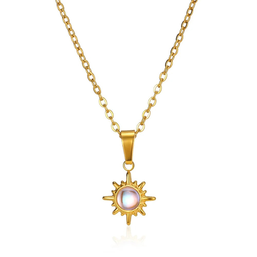 Kaklarota ar smalkām ķēdītēm un apaļu kulonu ar teksturētu virsmu un stikla akmeni centrā. Izgatavota no metāla un stikla. Viegls un daudzpusīgs dizains, piemērots jebkuram notikumam – no ikdienas līdz svētkiem. Ķēdītes garums aptuveni 45 cm ar 5 cm pagarinājumu, kulona izmērs aptuveni 2,5 cm garumā un 1,7 cm platumā.