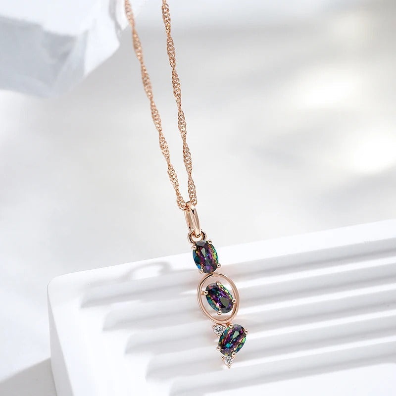 Kaklarota ar rozā zelta pārklājumu, rotāta ar zilu un caurspīdīgu kubisko cirkoniju. Viegls un daudzpusīgs aksesuārs. Kaklarotas garums aptuveni 45 cm ar papildu 5 cm pagarinājumu, kulona izmērs aptuveni 3 cm augstumā un 0,8 cm platumā.