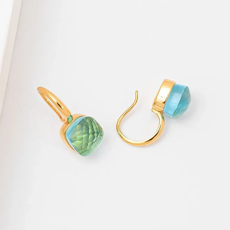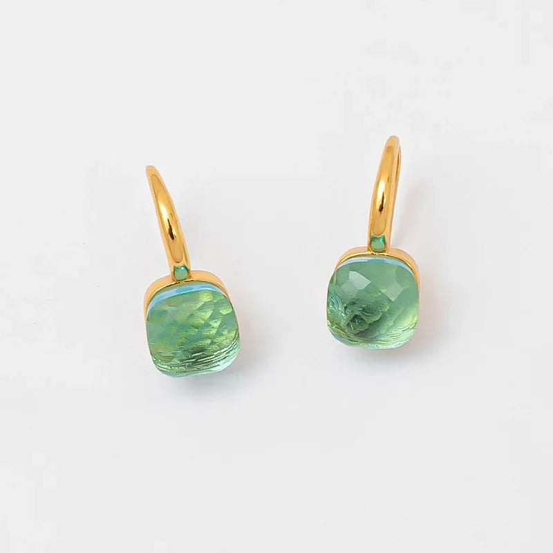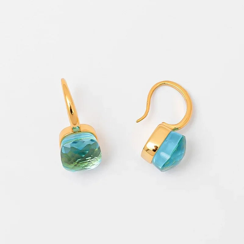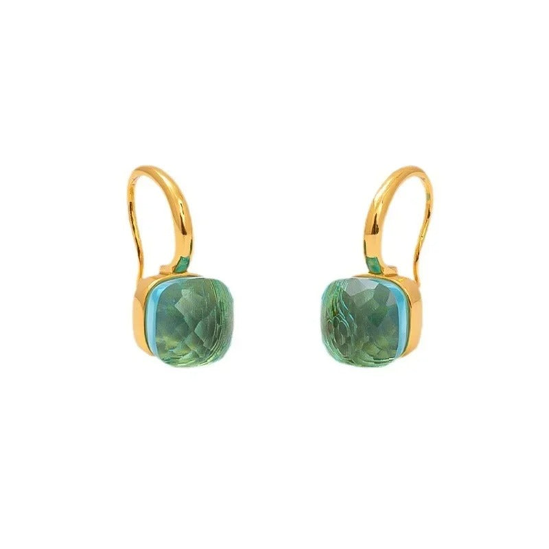 Metāla auskari ar zelta toņa pārklājumu un slīpētu stikla akmeni. Viegls un pārlaicīgs dizains. Auskaru garums aptuveni 2,5 cm, akmens platums aptuveni 0,9 cm.