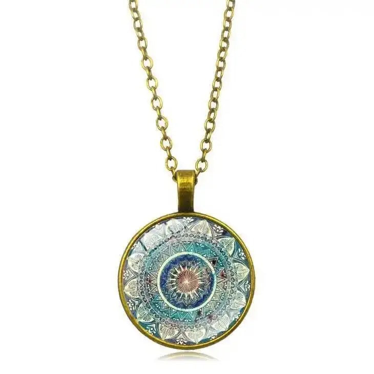 Kaklarota ar apaļu kulonu bronzas toņa ietvarā, rotāta ar mandalas rakstu tirkīza, zilā un baltā tonī. Izgatavota no metāla un stikla. Izsmalcināta rota, kas izstaro mieru un harmoniju. Ķēdītes garums aptuveni 45 cm ar papildu 5 cm pagarinājumu, kulona izmērs aptuveni 3,6 cm augstumā un 2,8 cm platumā, stikla detaļas diametrs aptuveni 2,5 cm.