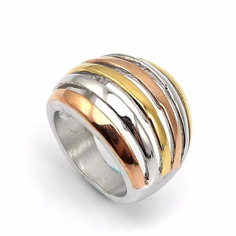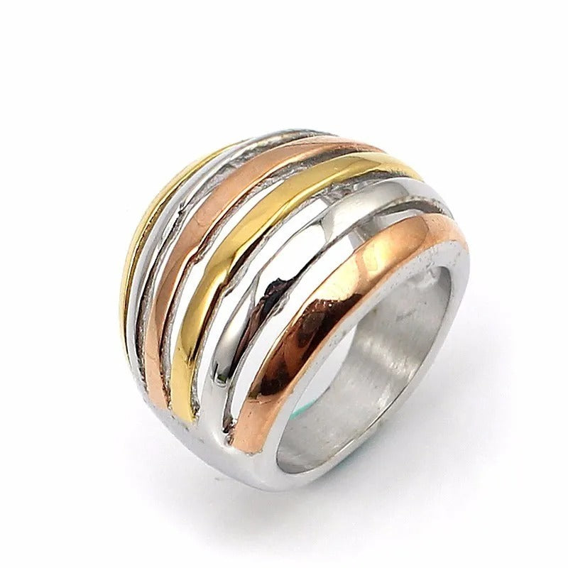 Plats nerūsējošā tērauda gredzens ar spīdīgu apdari, kas apvieno trīs toņus – sudraba, zelta un rozā zelta. Tīras līnijas piešķir elegantajam dizainam mūsdienīgu nokrāsu.