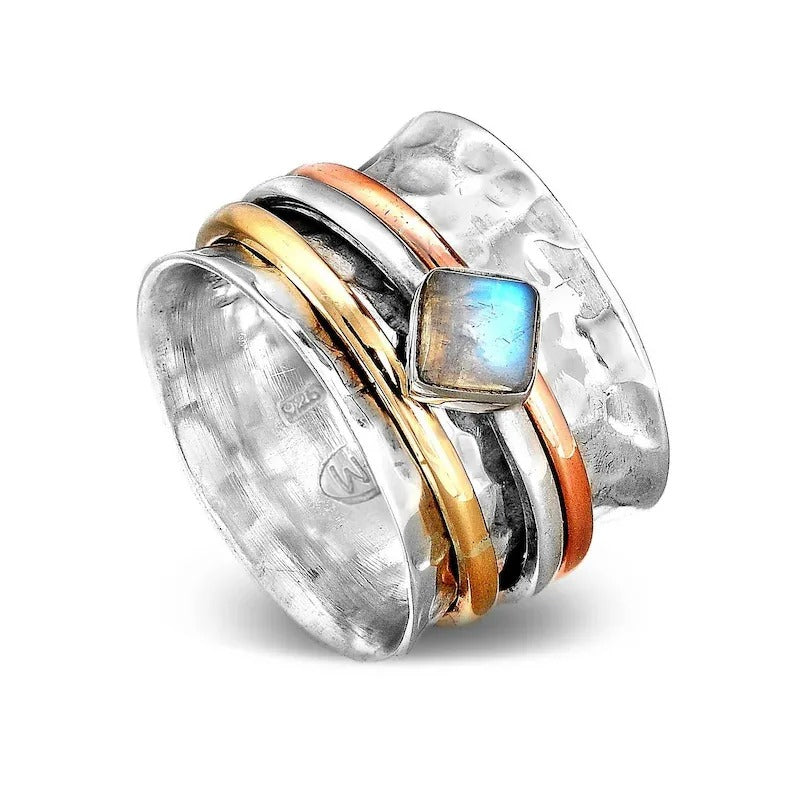 Plats sudraba gredzens ar kaltu tekstūru, rotāts ar zelta un vara akcentiem. Centrā atrodas kvadrātveida mēnesakmens, kas gaismā smalki maina krāsu. Izturīgs un raksturīgs dizains.